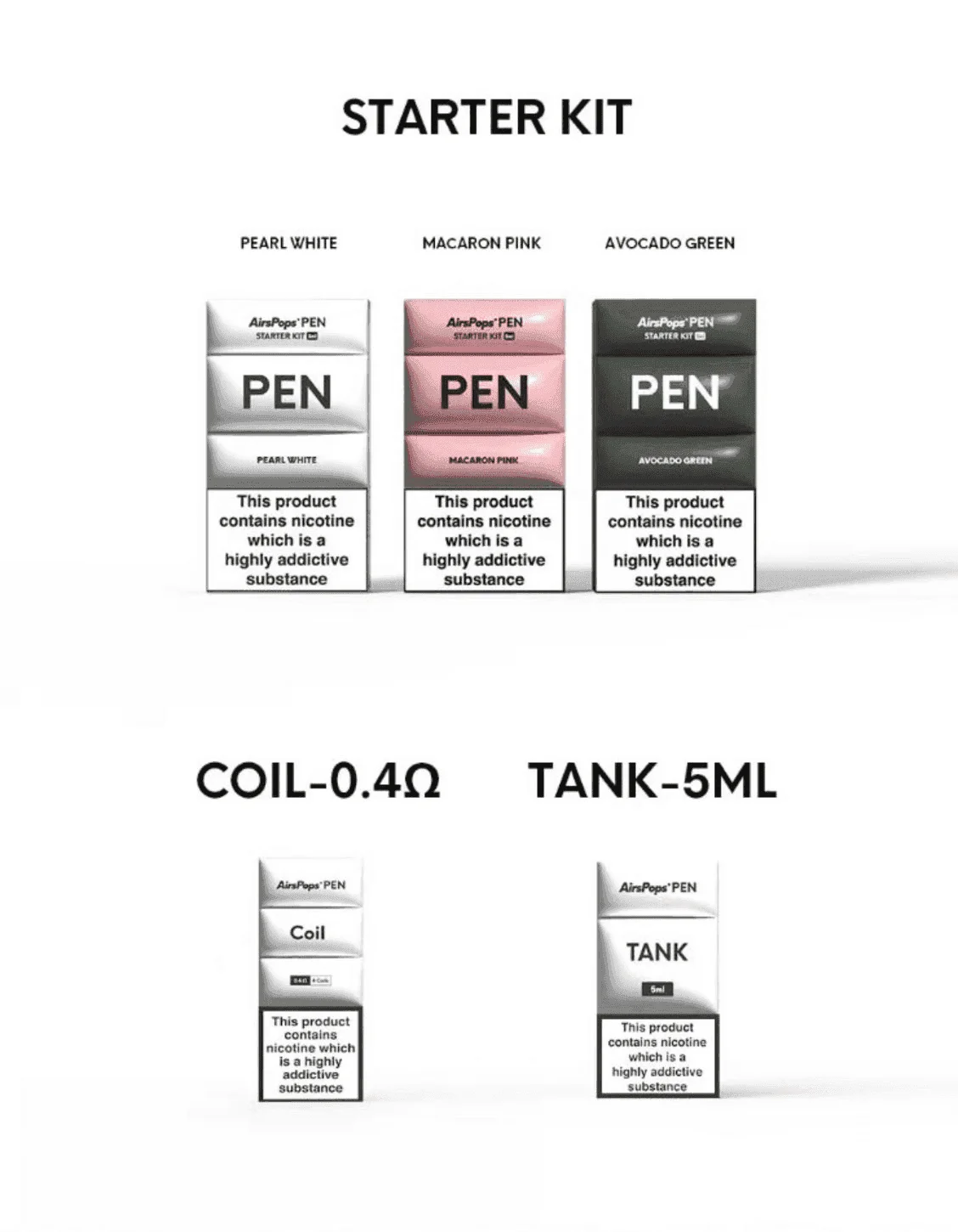 白色, 粉色, 軍綠色, 2ml空倉, 5ml空倉, 0.4歐姆芯(4入)